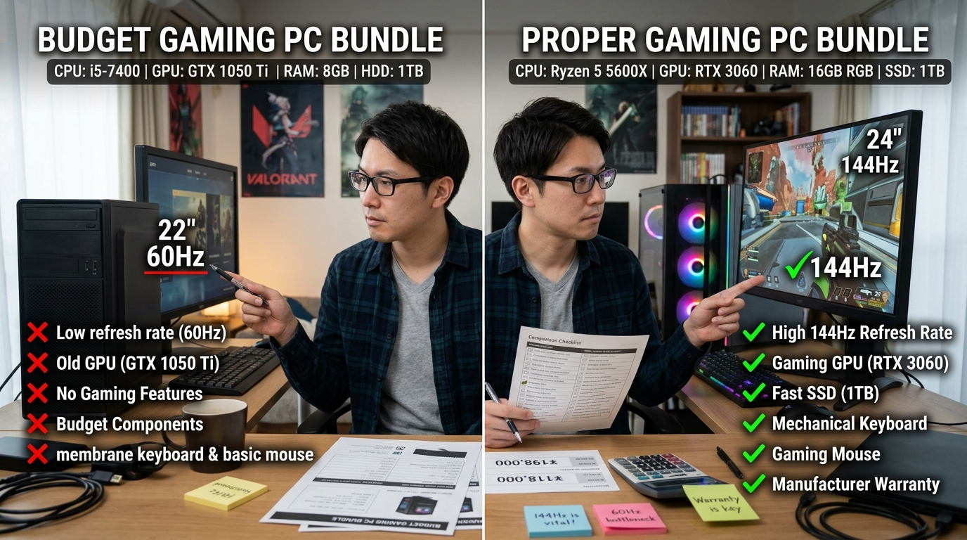 モニターのリフレッシュレートが低い、キーボードやマウスがゲーミング仕様でない、不要な周辺機器が含まれて割高になっている、といったケースがあります。個別の製品スペックを必ず確認しましょう。