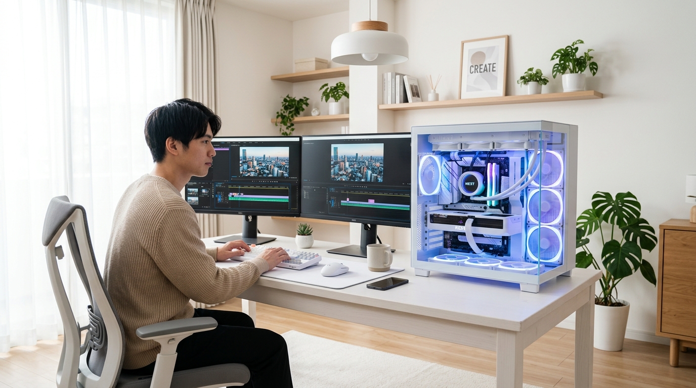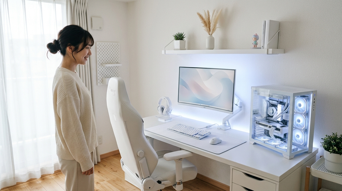 黒のPCだと「ゲーム部屋感」が強くなりがちですが、白のPCならスタイリッシュなワークスペースとしても違和感なく溶け込みます。